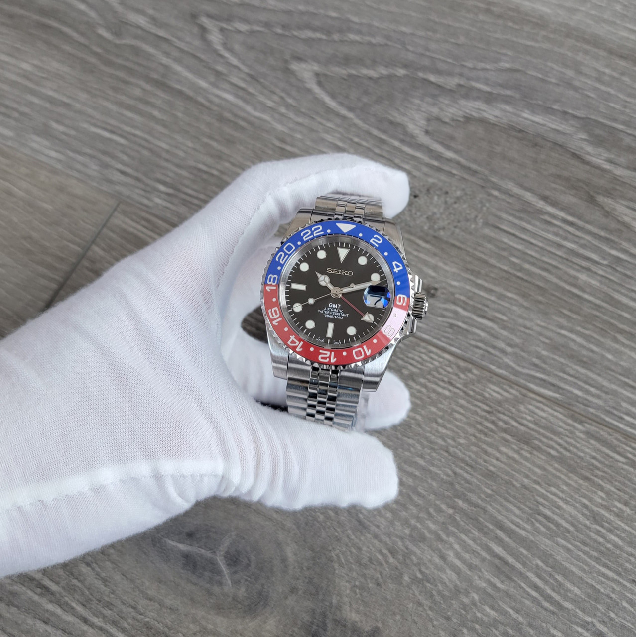This striking timepiece features a sunburst black dial with a vibrant red GMT hand, complemented by silver/white indicators and hour & second hands, creating a dynamic and modern look. Powered by the reliable NH34 GMT automatic movement, it includes a functional extra timezone hour hand, perfect for travelers. The 40mm case with a 13.5mm thickness offers a substantial presence while maintaining a comfortable fit. With 10 ATM water resistance, it's ready for any adventure. The scratch-resistant sapphire crystal ensures lasting clarity, and the date cyclops adds practicality for everyday use. The GMT red/blue premium ceramic insert bezel with a 120-click unidirectional rotation provides durability and precision. Paired with a modern-style jubilee bracelet, this watch effortlessly blends luxury with functionality.