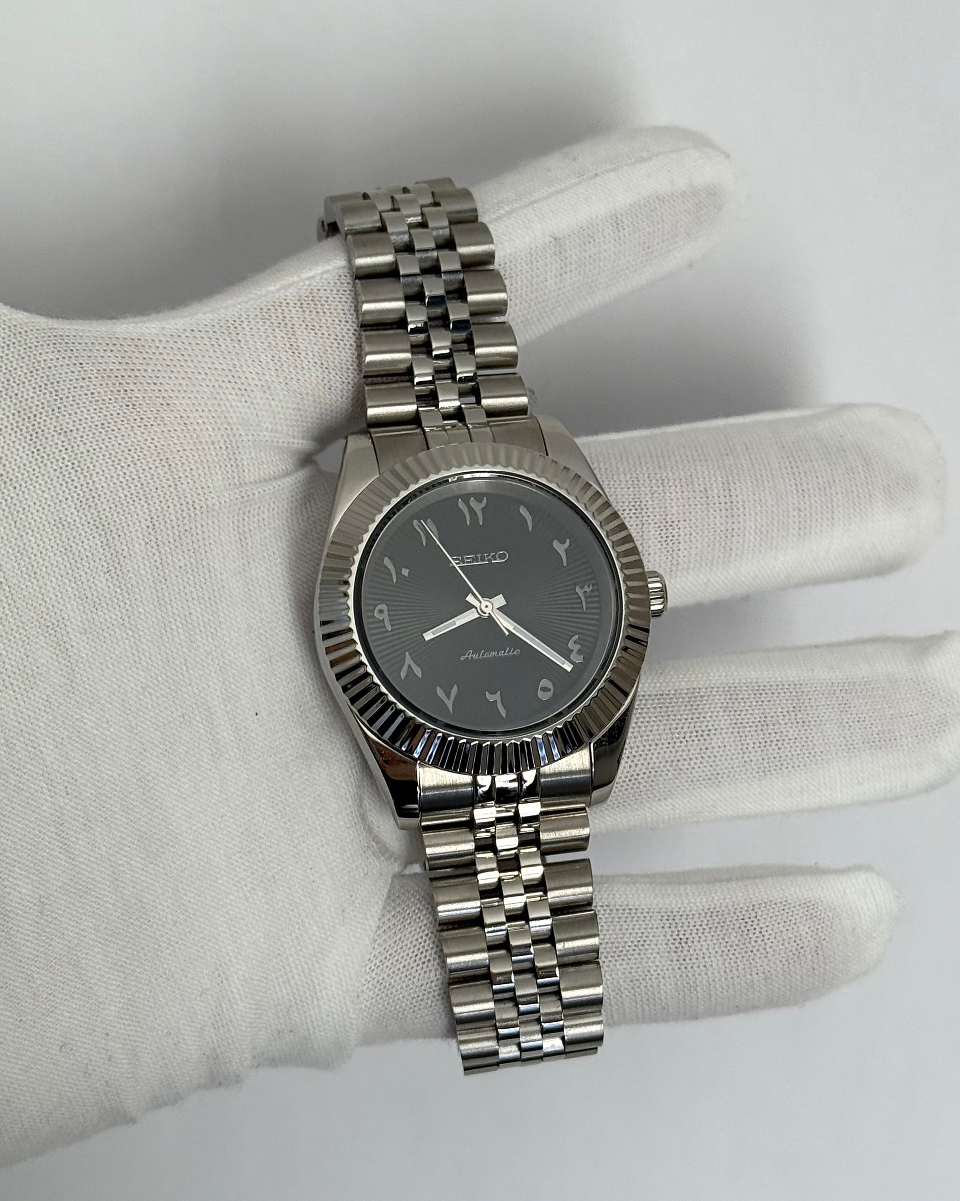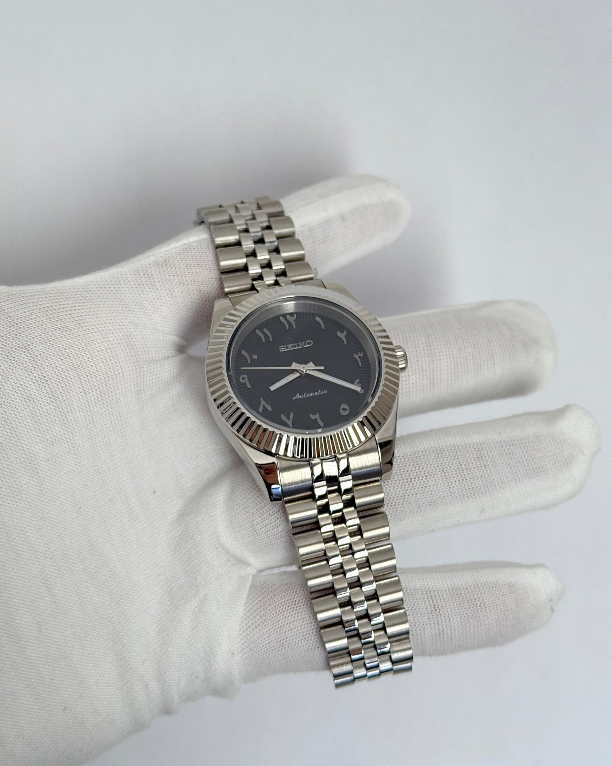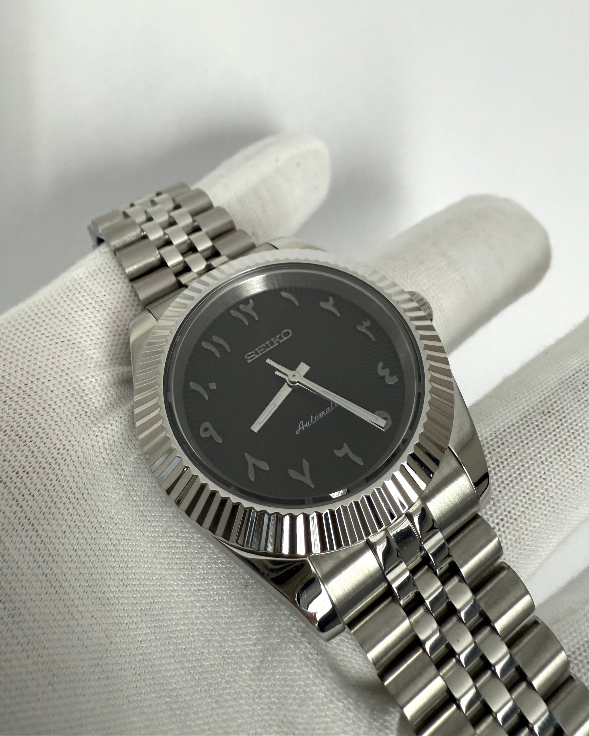 This timepiece showcases a Dawn Black Arabic dial, exuding a bold yet refined aesthetic that seamlessly blends tradition with modern craftsmanship. Built from premium 316L stainless steel, the case offers exceptional durability and a sleek, polished finish. Powered by the reliable NH35 automatic movement, its intricate mechanics can be admired through the exhibition-style sapphire case back. Designed for both style and resilience, this watch features a scratch-resistant sapphire crystal, screw-down crown, and 5 ATM water resistance. Completing its sophisticated look, the modern-style jubilee bracelet ensures a comfortable and elegant fit. Available in 36mm and 39mm, this timepiece is a true statement of timeless design and precision engineering.