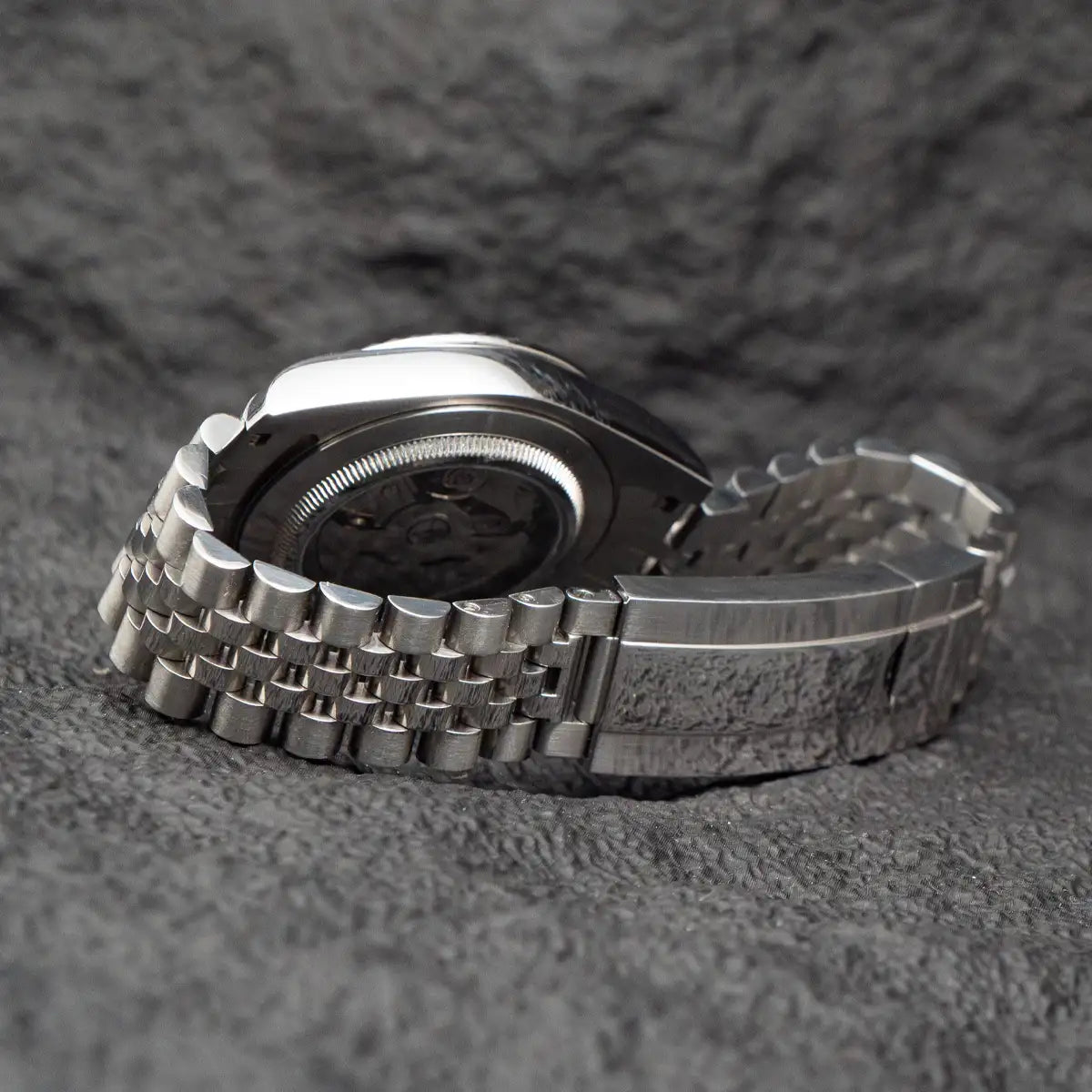 This timepiece showcases a Dawn Black Arabic dial, exuding a bold yet refined aesthetic that seamlessly blends tradition with modern craftsmanship. Built from premium 316L stainless steel, the case offers exceptional durability and a sleek, polished finish. Powered by the reliable NH35 automatic movement, its intricate mechanics can be admired through the exhibition-style sapphire case back. Designed for both style and resilience, this watch features a scratch-resistant sapphire crystal, screw-down crown, and 5 ATM water resistance. Completing its sophisticated look, the modern-style jubilee bracelet ensures a comfortable and elegant fit. Available in 36mm and 39mm, this timepiece is a true statement of timeless design and precision engineering.