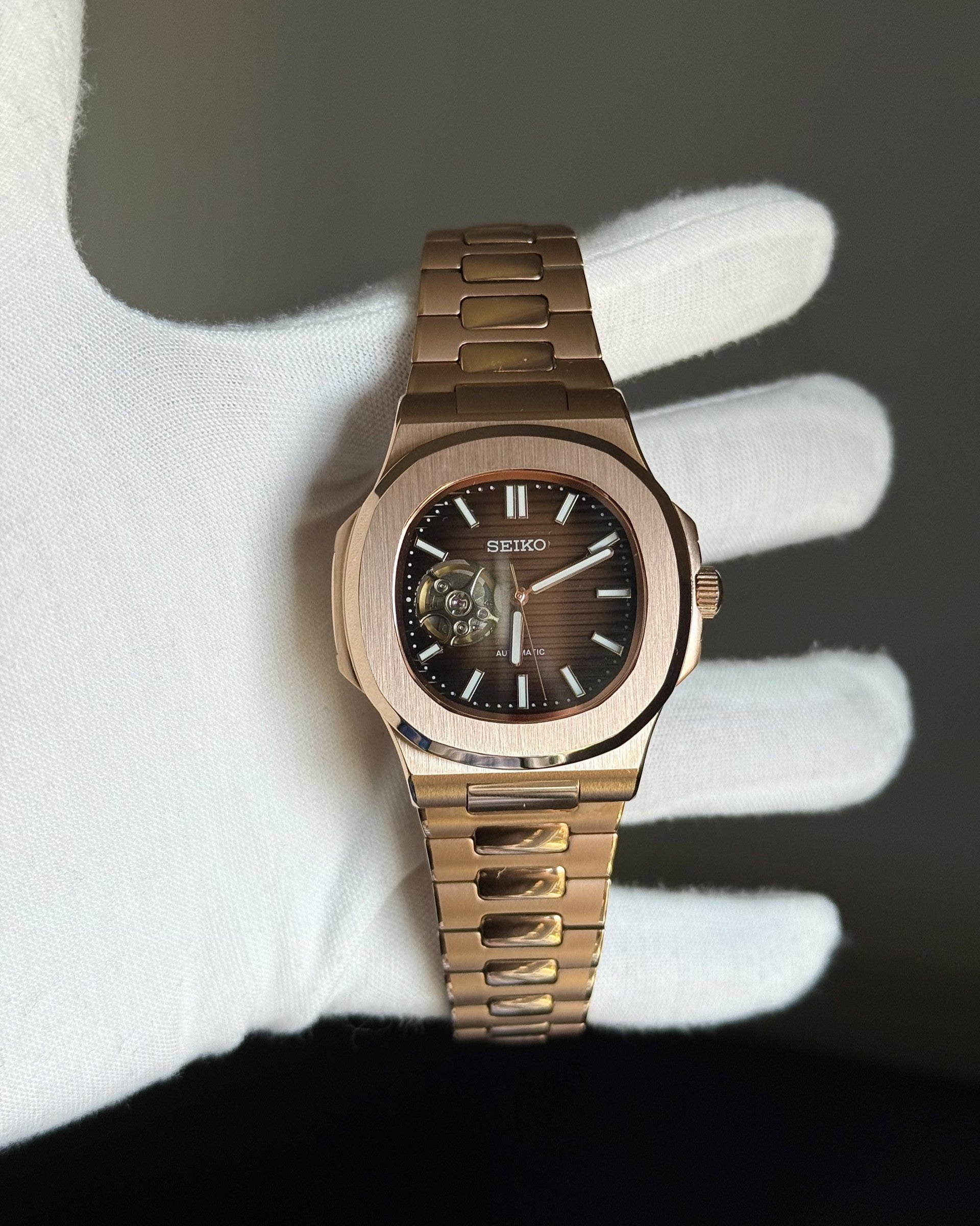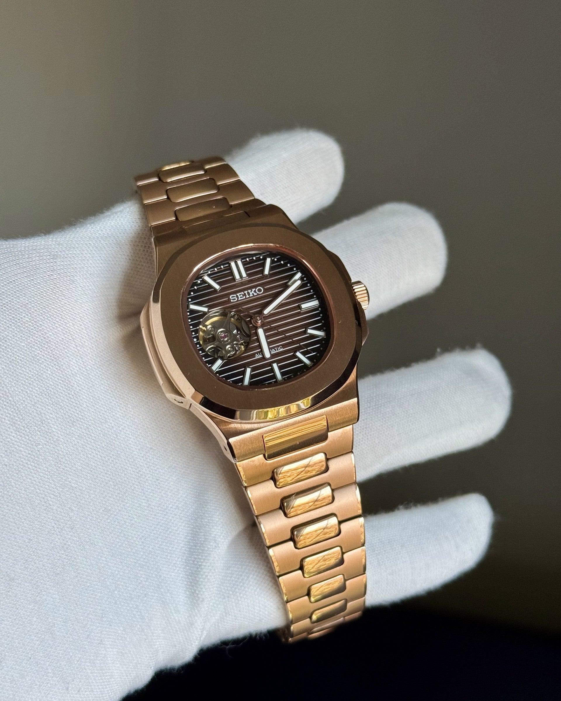 Showcasing a striking sunburst chocolate "open heart" dial, this timepiece offers a glimpse into the NH35 automatic movement through its uniquely designed cutout. Crafted from 316L stainless steel with a 40mm case, it features a sleek butterfly-style clasp bracelet for a seamless fit. Finished with a scratch-resistant sapphire crystal and 10 ATM water resistance, this watch blends technical intrigue with everyday durability, weighing in at a solid 145g.