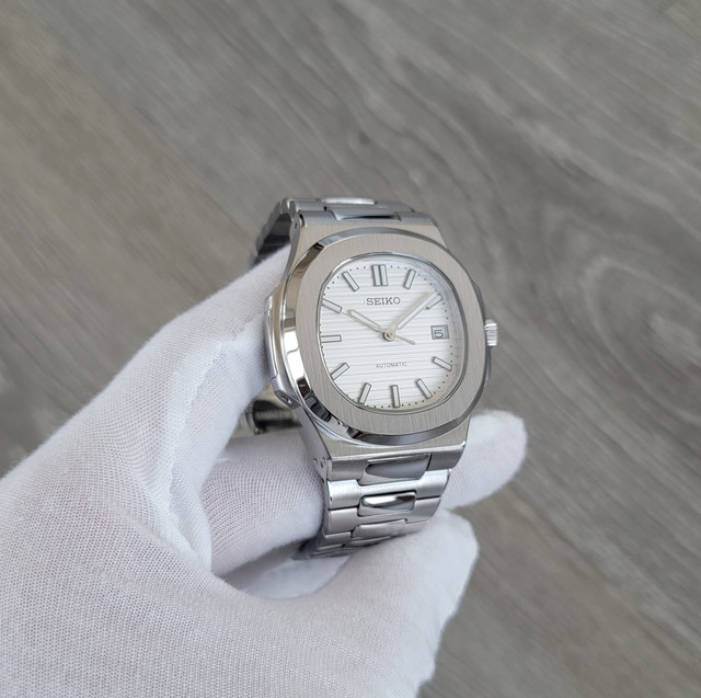 This sophisticated timepiece features a white embossed textured dial, exuding a clean and refined aesthetic. Encased in a 40mm stainless steel case with a 12mm thickness, it offers a perfect balance of presence and comfort. The trusted NH35 automatic movement ensures reliable performance, while the clear sapphire glass case back provides a glimpse into the intricate mechanics within. Designed for durability, it boasts 10 ATM water resistance and a scratch-resistant sapphire crystal for enhanced clarity and protection. Completing its elegant design, the stainless steel bracelet with a fold-over butterfly clasp ensures a secure and seamless fit, making this watch an ideal choice for those who appreciate both style and craftsmanship.
