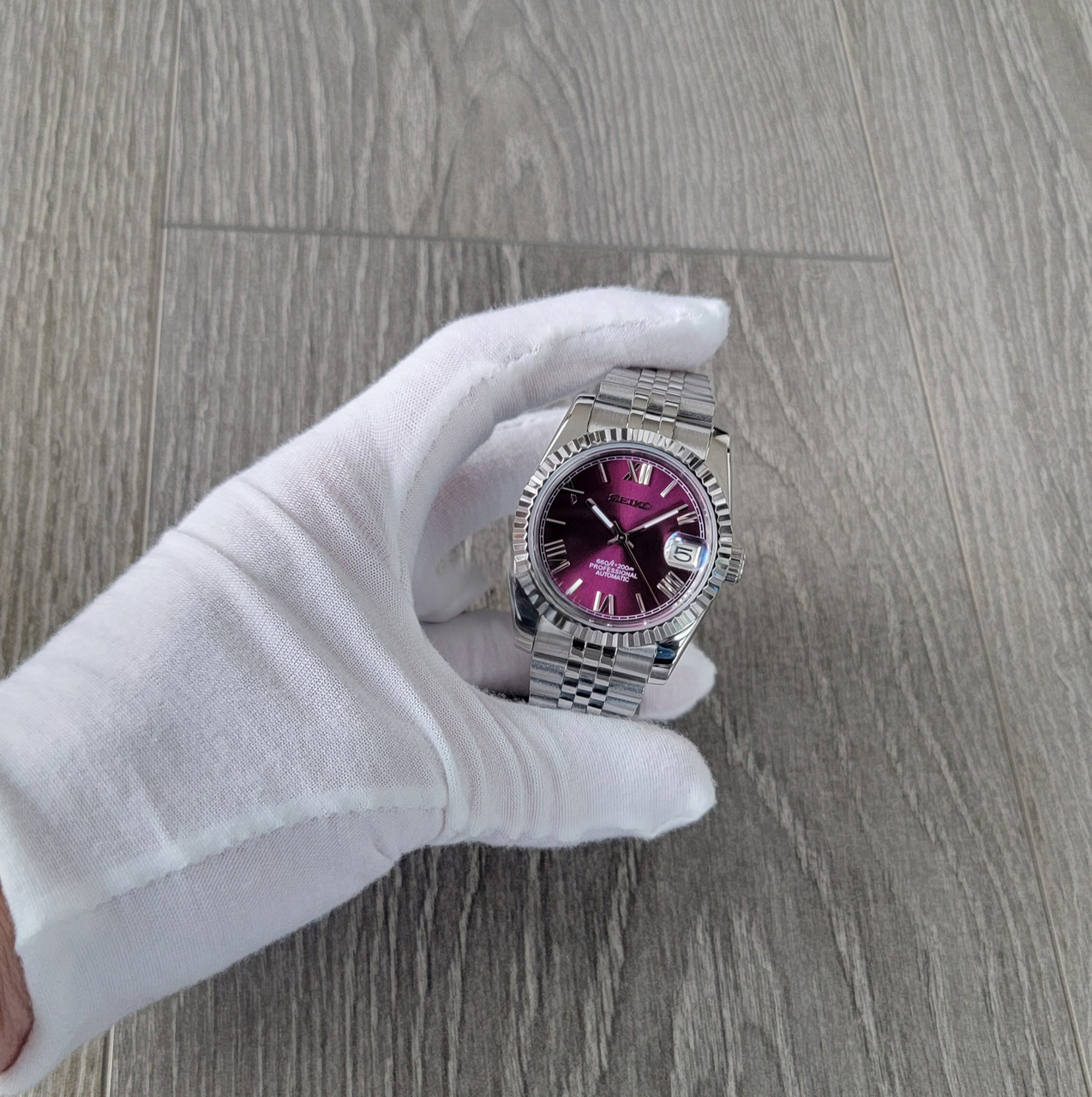 This stunning timepiece showcases a sunburst red grape dial, radiating depth and sophistication. Accentuated by high-polish Roman numeral indicators and silver/white hands, it exudes a refined yet modern aesthetic. Crafted from premium 316L stainless steel, the case ensures exceptional durability with a sleek, polished finish. At its heart, the NH35 automatic movement powers the watch with precision, beautifully displayed through the exhibition-style sapphire case back. Designed for both style and resilience, it features a scratch-resistant sapphire crystal, screw-down crown, and 5 ATM water resistance. Paired with a modern-style jubilee bracelet, this watch offers both comfort and timeless appeal. Available in 36mm and 39mm, it is a standout piece for any watch enthusiast.