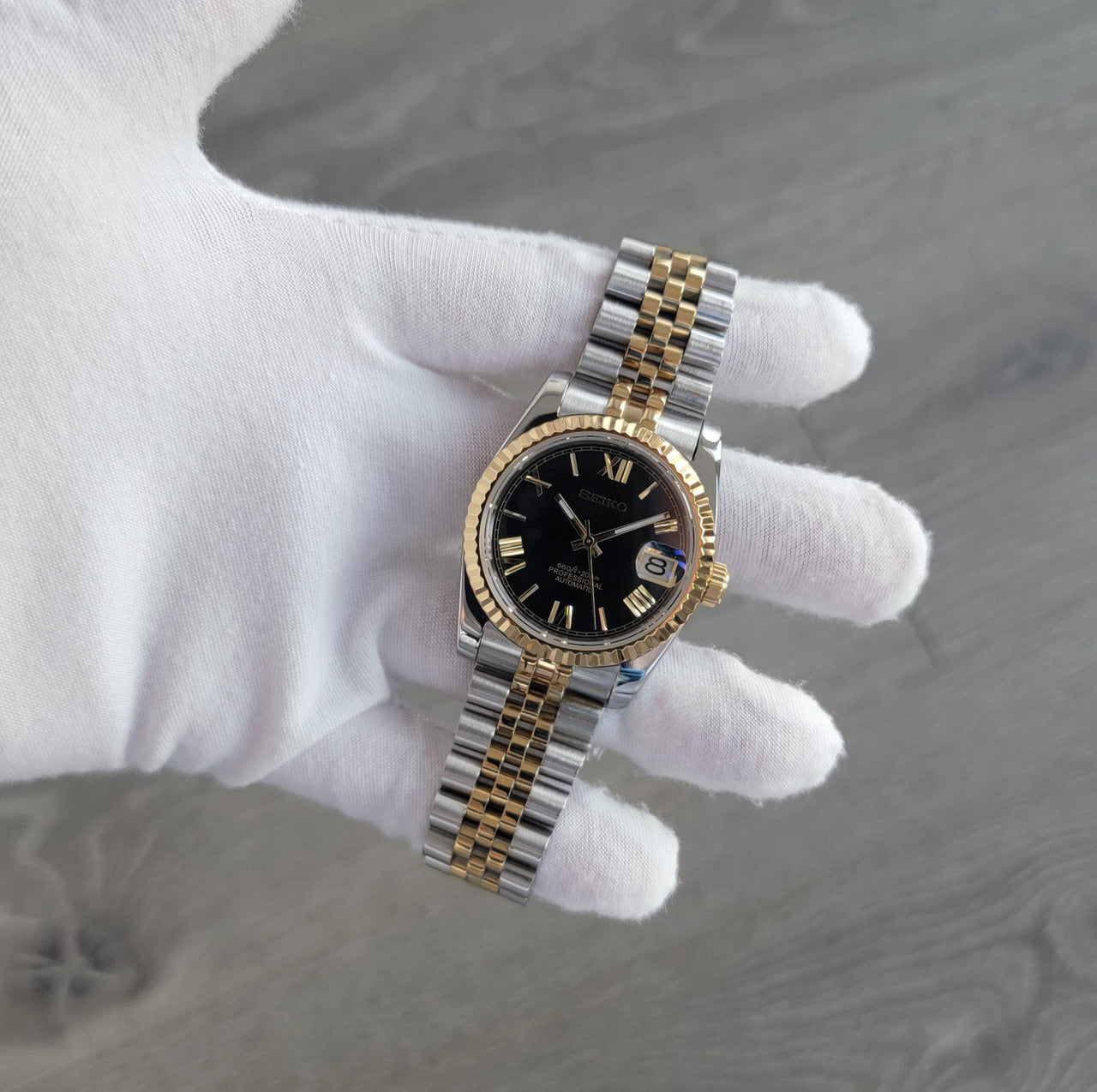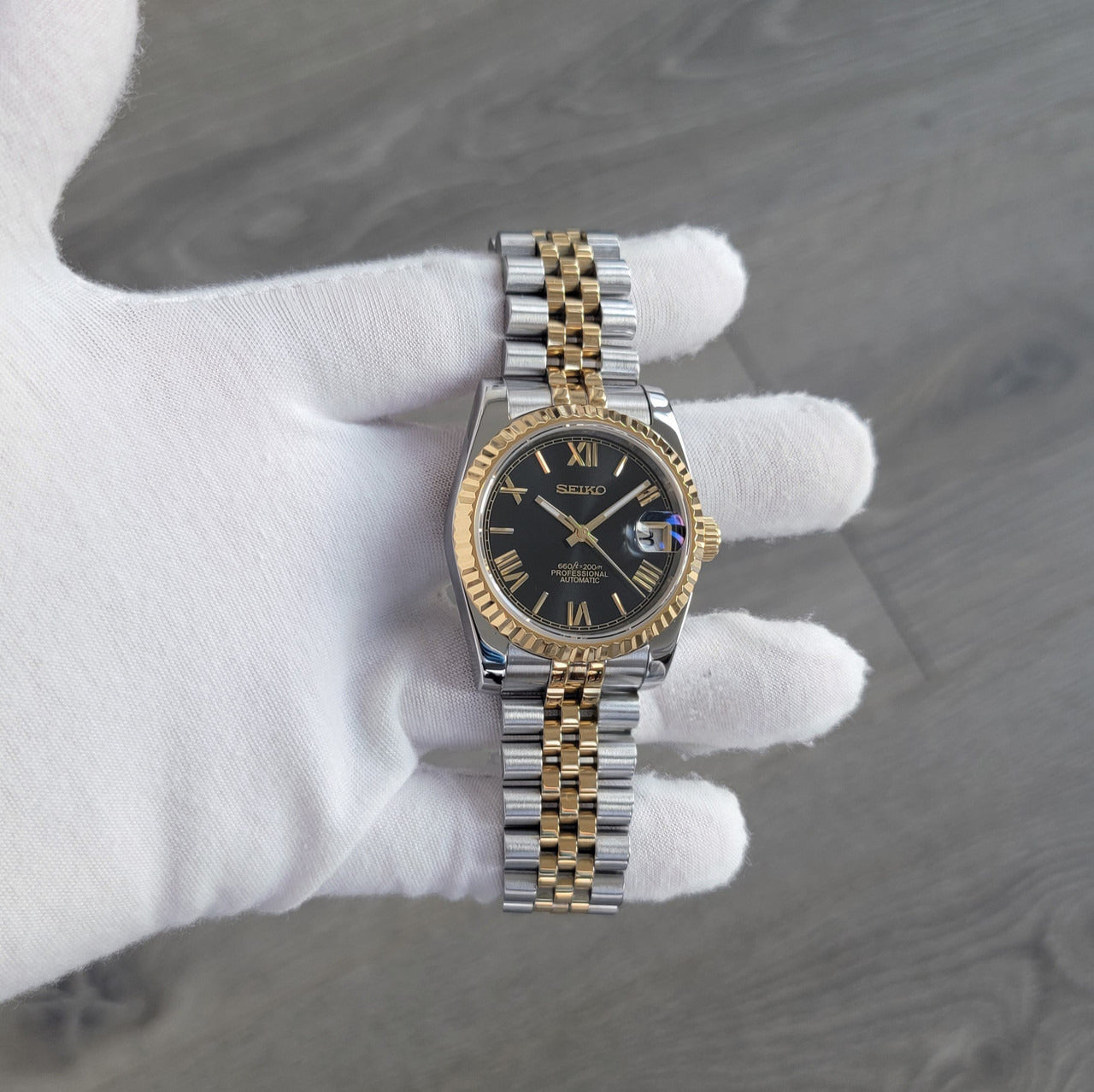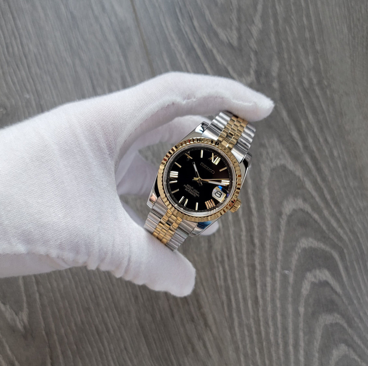 This stylish timepiece features a sunburst matte black dial accented with gold-tone alloy and white hands and indices, offering a bold yet refined contrast. The 36mm or 39mm case is crafted from durable 316L stainless steel, paired with a modern two-tone jubilee bracelet in yellow gold color alloy for a touch of classic luxury. Powered by the reliable NH35 automatic movement, it delivers precise and consistent performance. Finished with a scratch-resistant sapphire crystal and 5 ATM water resistance, this 145g watch combines durability with timeless elegance for everyday wear.