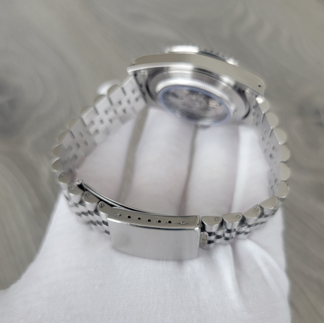 This stunning timepiece features a matte black dial with a unique vintage red GMT hand, perfectly complemented by vintage tropical indicators and sleek hour & second hands, offering a bold yet timeless look. Powered by the reliable NH34 GMT automatic movement, it allows you to easily track a second time zone with the functional extra time zone hour hand. The 40mm case, with a 13mm thickness, offers a balanced design that's both sturdy and comfortable. With 5 ATM water resistance, it's well-suited for daily wear. The scratch-resistant sapphire crystal ensures lasting clarity, while the GMT black/red aluminum bezel with smooth vintage bi-directional GMT bezel action provides precision and style. The watch is finished with a modern jubilee style bracelet featuring solid end links for added durability and comfort. This watch is a perfect blend of vintage appeal and contemporary functionality.