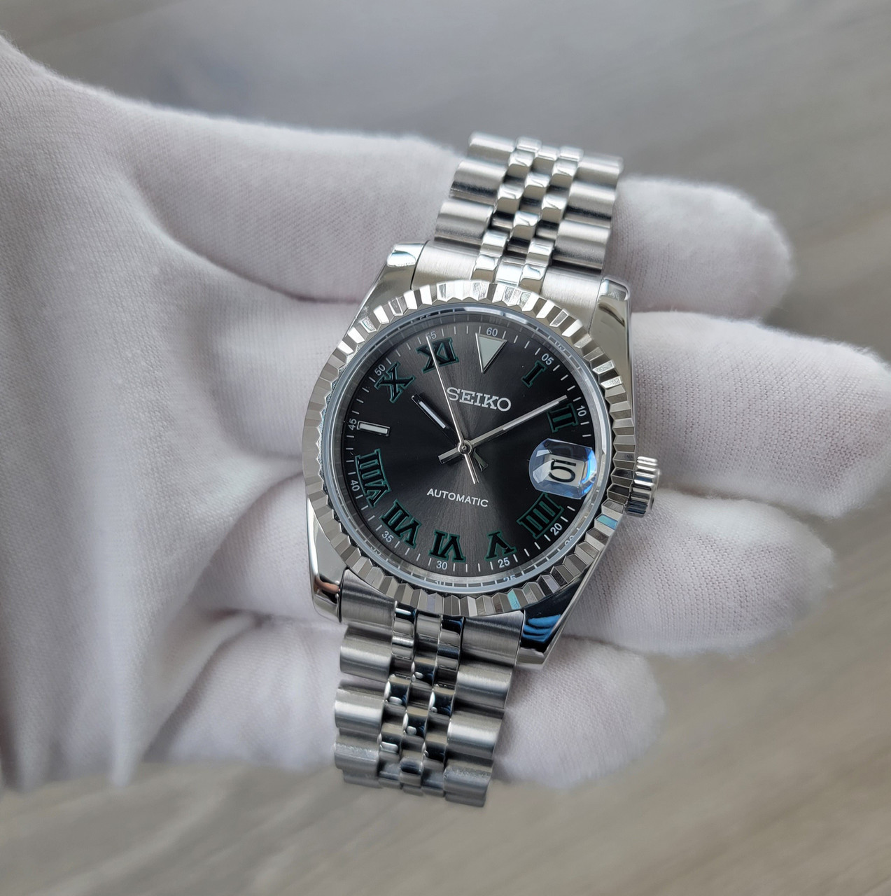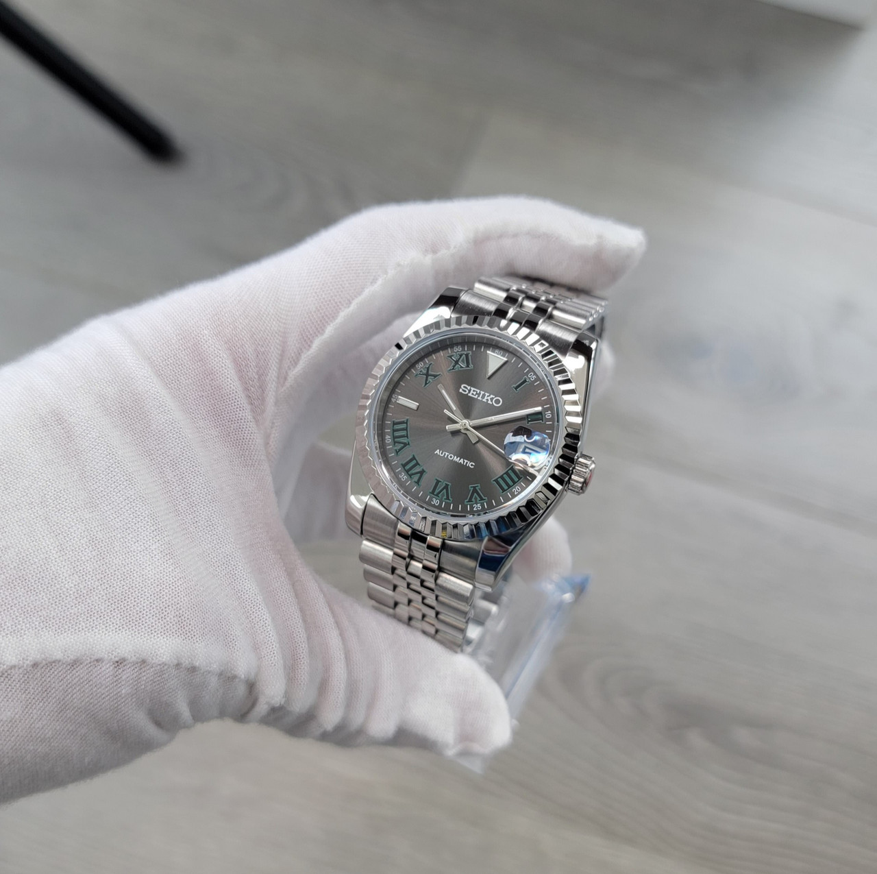 This stunning timepiece features a sunburst grey dial, elegantly complemented by silver alloy and white hands, along with green and black Wimbledon-style Roman numerals, creating a distinctive and refined look. Constructed from high-quality 316L stainless steel, the case offers exceptional durability and a polished finish that enhances its sleek aesthetic. At its core, the NH35 automatic movement ensures reliable performance, showcased through the exhibition-style sapphire case back for a glimpse into its intricate craftsmanship. Built for both style and resilience, it features a scratch-resistant sapphire crystal, screw-down crown, and 5 ATM water resistance. Paired with a modern-style jubilee bracelet, this watch delivers a perfect combination of comfort and timeless sophistication. Available in 36mm and 39mm, it's a true statement piece for any collection.